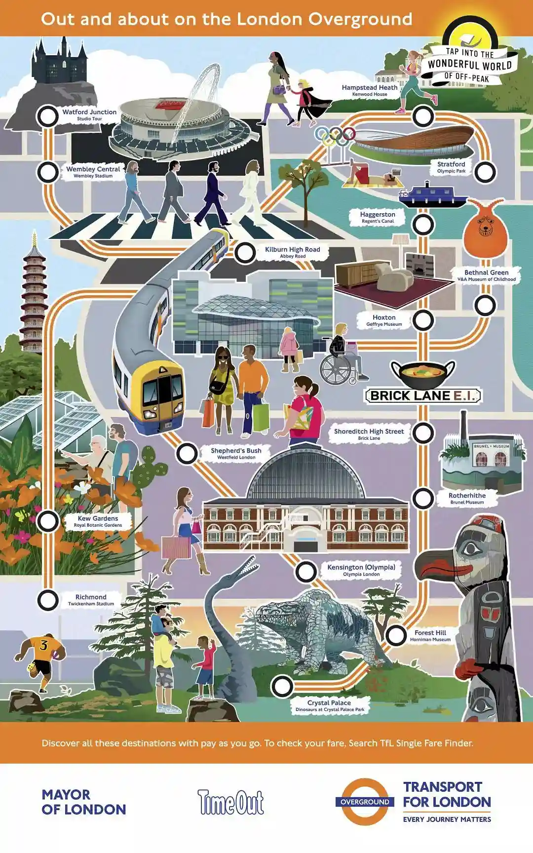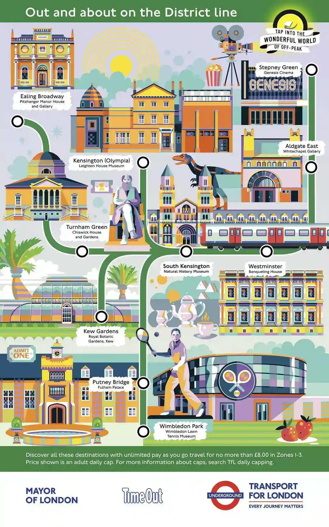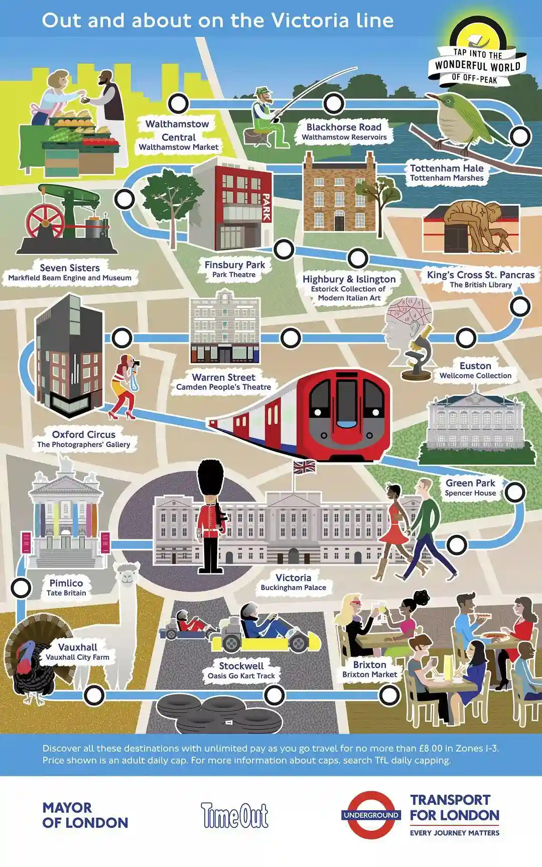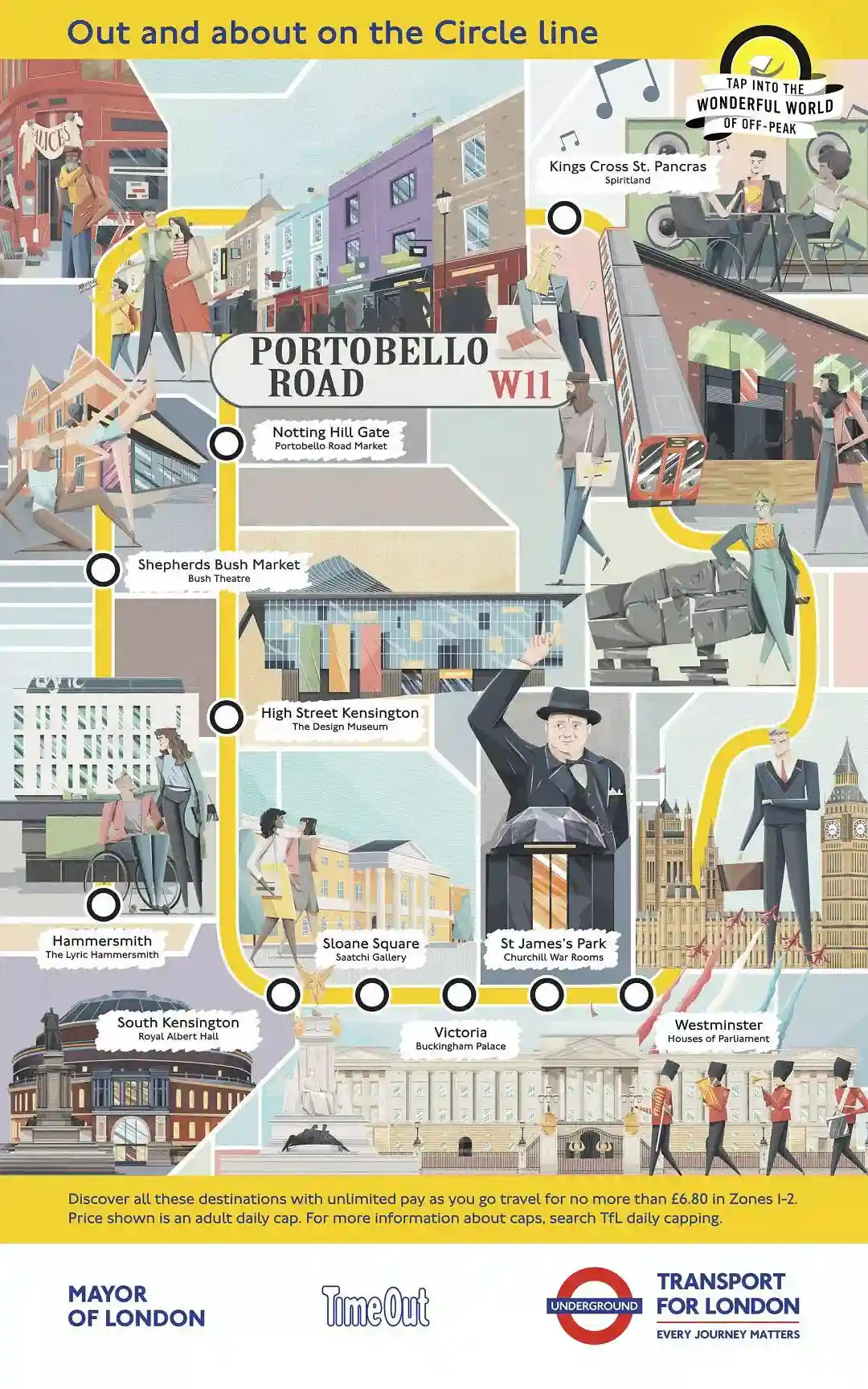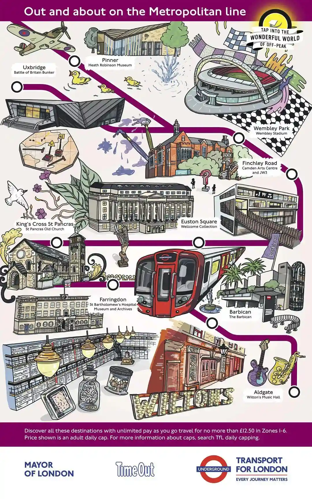 伦敦地铁,伦敦市政和Timeout(知名的伦敦出行资讯网站)合作推出了TapintotheWonderfulWorldofOff-Peak,即"在伦敦错峰旅行"的宣传活动,为伦敦11条地铁(包括地上铁)线路手绘线路景点图.