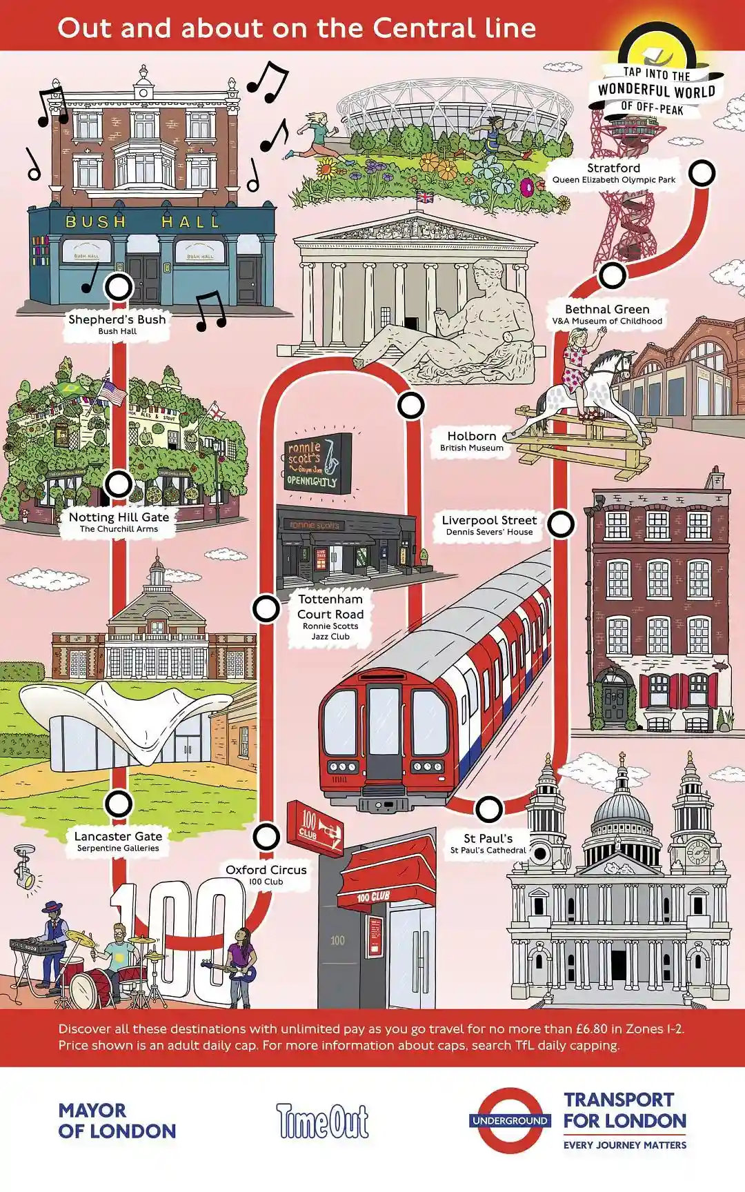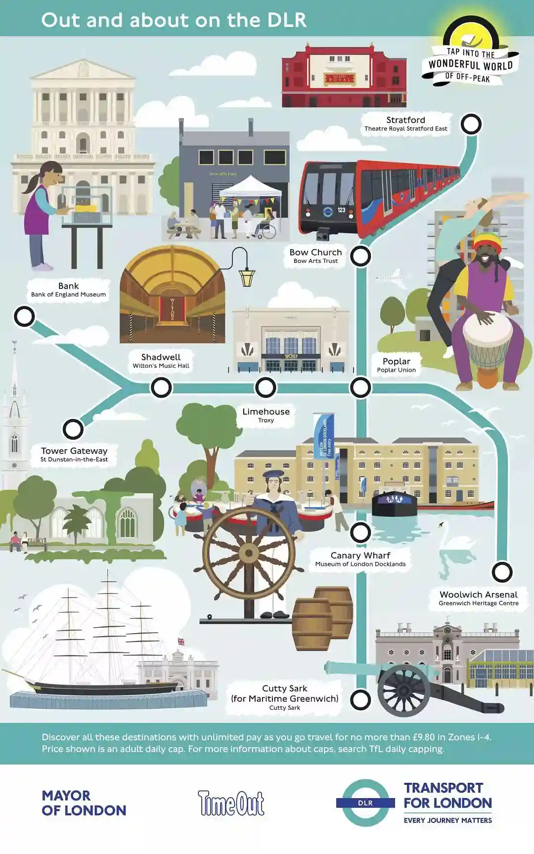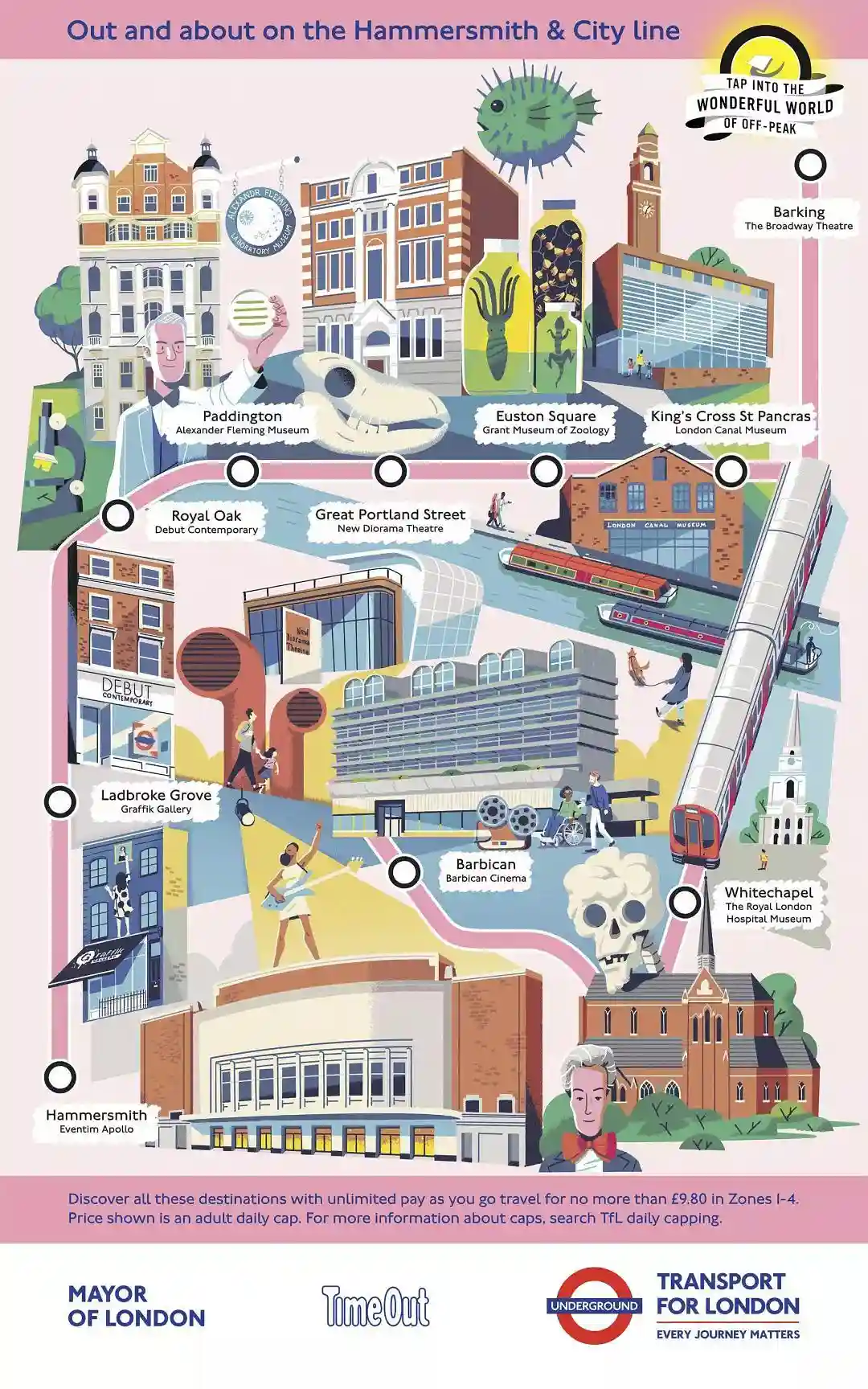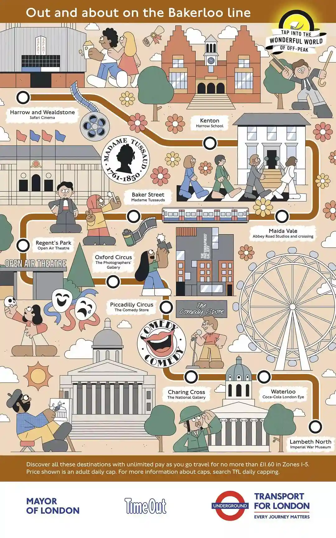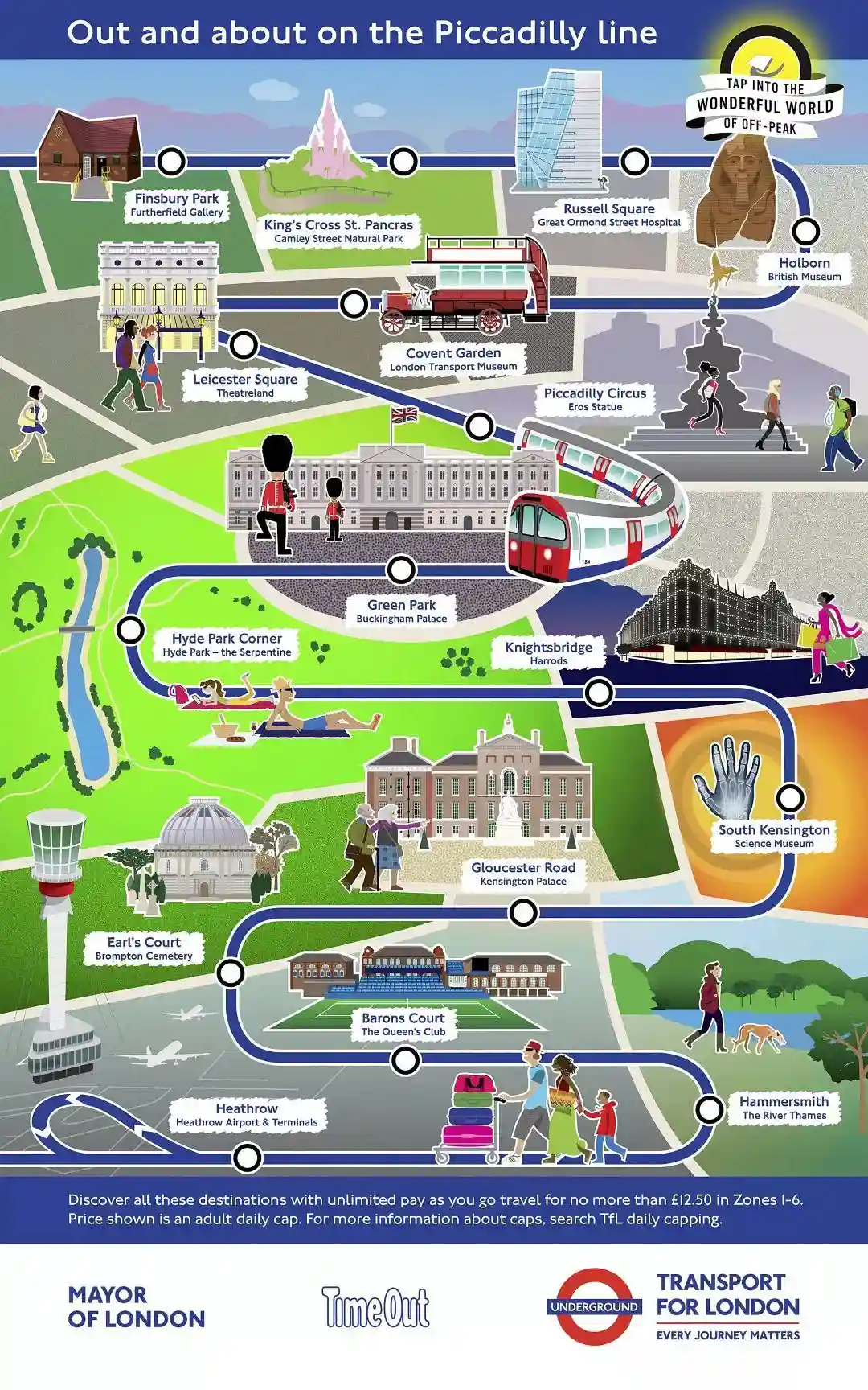 伦敦地铁,伦敦市政和Timeout(知名的伦敦出行资讯网站)合作推出了TapintotheWonderfulWorldofOff-Peak,即"在伦敦错峰旅行"的宣传活动,为伦敦11条地铁(包括地上铁)线路手绘线路景点图.