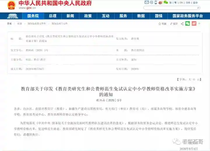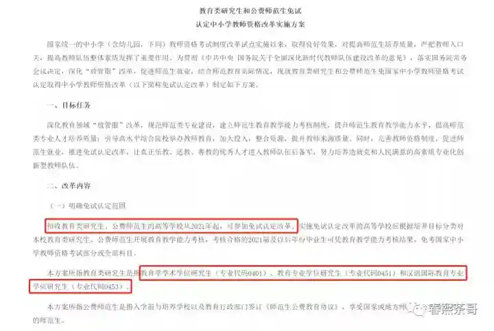 教育部在2020年9月4日发布了一则通知:《教育类研究生和公费师范生免试认定中小学教师资格改革实施方案》。从2021年起,教育类研究生可免试认定中小学教师资格。如下: