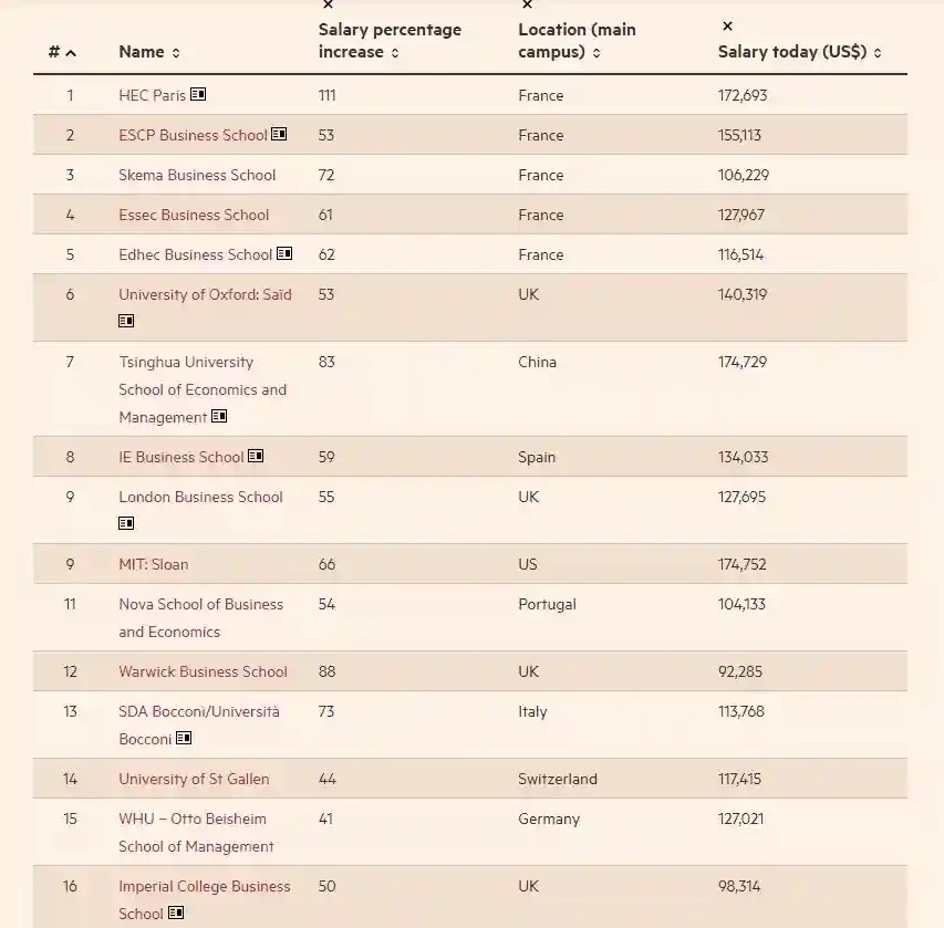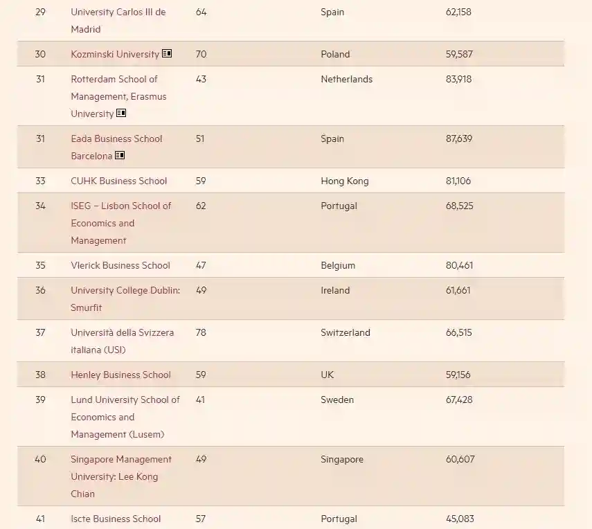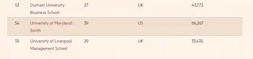 在这个表单中,英国有12所大学上榜:牛津(6),伦敦商学院(9),华威(12),帝国理工(16),伦敦大学城市学院(22),雷丁(38),爱丁堡(42),克兰菲尔德(44),兰卡(46),埃克塞特(50),杜伦(53),利物浦(55)。