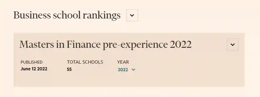 2022全球金融硕士排名榜一共有19项指标,其中16项计入总分。排名指标包括:毕业后三年的平均校友工资,薪资涨幅,职业发展水平,学校职业服务,毕业三个月内找到工作的比例等16项指标。“FTMastersinFinance2022Ranking”是该排名项目自创立以来的第11版。而每年的版本都会同时给出两个排名列表,分别是:需要工作经验的硕士项目(post-experience)和无需工作经验的硕士项目(pre-experience)。