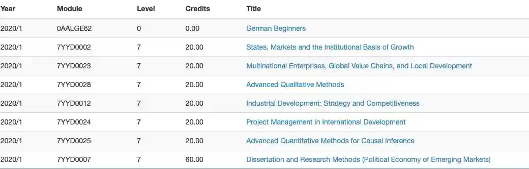我们专业共有180个学分,其中包括一门必修课(States,MarketsandtheInstitutionalBasisofGrowth)和五门选修课(每门各20学分),以及毕业论文(60学分)。每学期选择的课程数不能超过三门,所以大家的安排普遍是第一学期三门,第二学期三门,第三学期毕业论文写作。