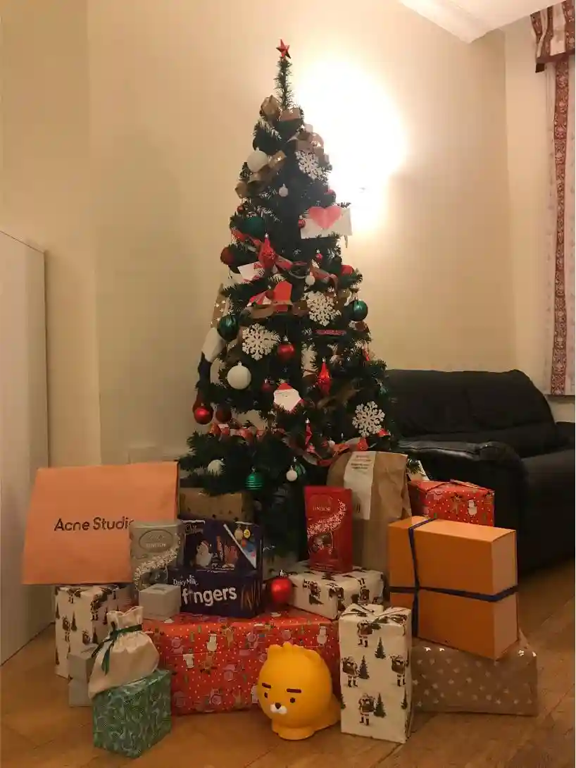 圣诞节伦敦疫情最严重的时候,我跟室友一起买了圣诞树,并且互相秘密地挑选了小礼物,在圣诞夜的那晚煮着热红酒惊喜地开箱。