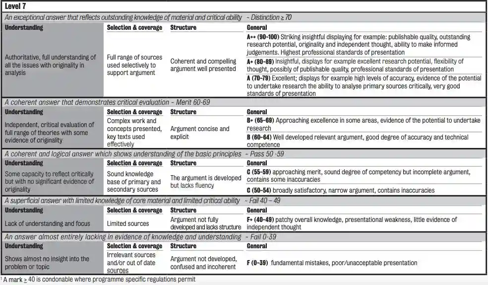 考核的方式大多为论文写作,具体可分为日常论文,期中期末论文,以及24小时论文三种,各分数占比以及考核模式要看授课老师的安排。专业的成绩等级分为四个等级:Fail(0-49分),Pass(50-59分),Merit(60-69分),Distinction(=70分)。