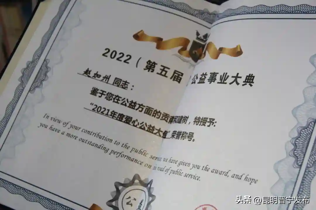 赵加州说,她从来到晋宁后就爱上了这片热土,她的梦想,是在这里被慢慢点燃的。在社会各界爱心企业、爱心人士的加持下,赵加州和她的公益团队每年都要给失能、失独老人以及需要照顾的群众送温暖送关怀,开展数十场活动。多年来,大大小小的公益活动开展了近千场,她在弘扬中华优秀传统文化的同时,也促进了家风建设,包括企业在内,捐资捐物达数百万元。她个人前前后后也捐出了20多万元。有人和她开玩笑说:“为了公益,你快捐出一套房子钱了。”对此,她总是笑着回答:“晋宁这片热土成就了我,我也应该回馈这片热土。”这些年,她受到了各级嘉奖和表彰,捧回了“2021年度爱心公益大使”等不少奖杯,先进公益事迹还被载入博鳌典藏。这些,都是对她点点滴滴付出的肯定和褒奖。