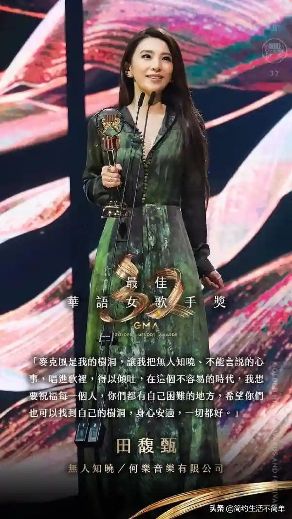 获奖感言田馥甄说道:麦克风是我的树洞,让我把无人知晓、不能言说的心事,唱进歌里!希望你们也可以找到自己的树洞,听着歌找到无人知晓的你自己!