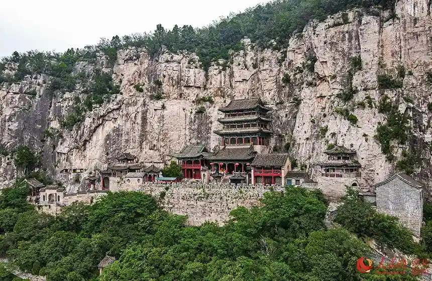 在娲皇阁外山崖上有北齐时期的摩崖刻经6部,多达13.74万字,被誉为“天下第一壁经群”。纵观娲皇阁,嵌于绝壁,结构凌虚,登楼远眺,太行群山涌翠,漳水如带,堪称“天造地设之境”。正因如此,国家文物古建筑专家罗哲文教授把娲皇宫与长城、赵州桥、料敌塔等建筑称为中国古建筑之精华,中华文明的形象化标志。