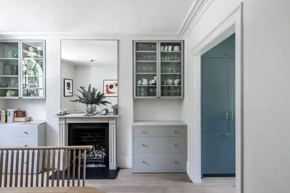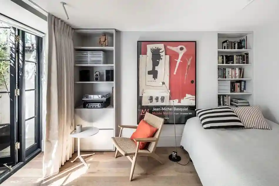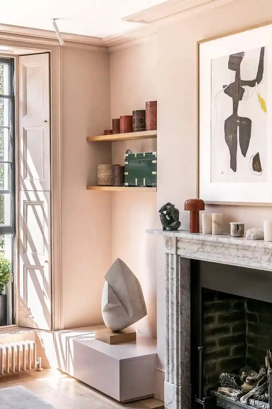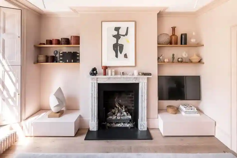 文艺复兴时期的大理石壁炉黑白对比鲜明,而抽象挂画和隔板上形状各异的摆设巧妙地增添了这个纯色空间的趣味感。
