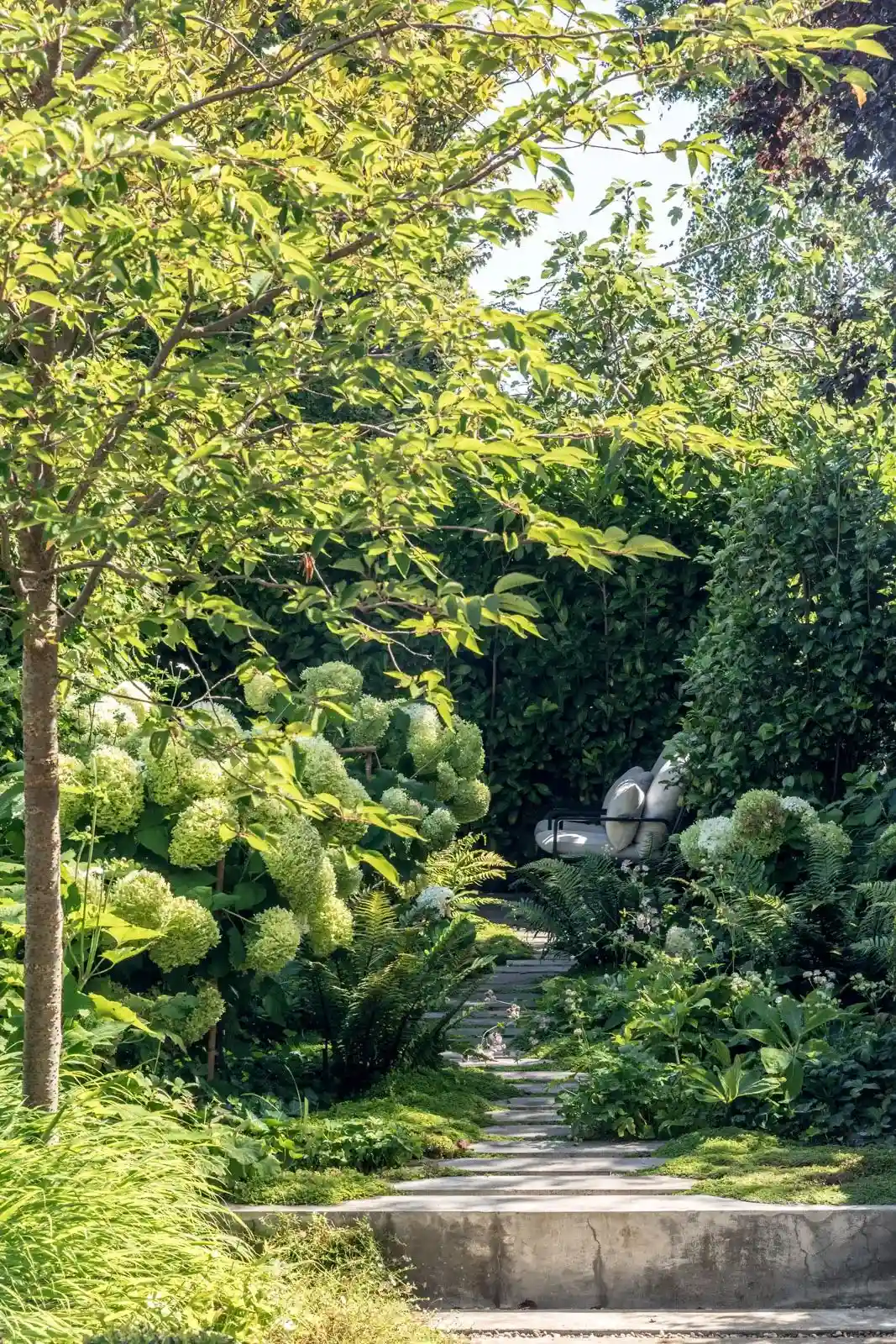 私人花园,她请了园林设计师StuartCraine为这个约6.5㎡的花园设计种植方案,有白色的绣球花、雕塑般的盒状灌木和茂盛的蕨类植物,整体感觉优雅精致。
