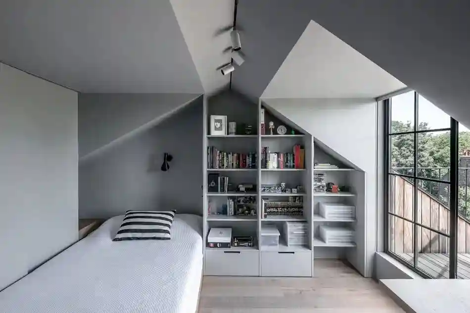 四楼卧室以浅灰色为主色调,屋形斜面天花板加嵌入式置物架,简洁有趣。