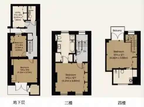 卧室分布在地下层,三楼和四楼。