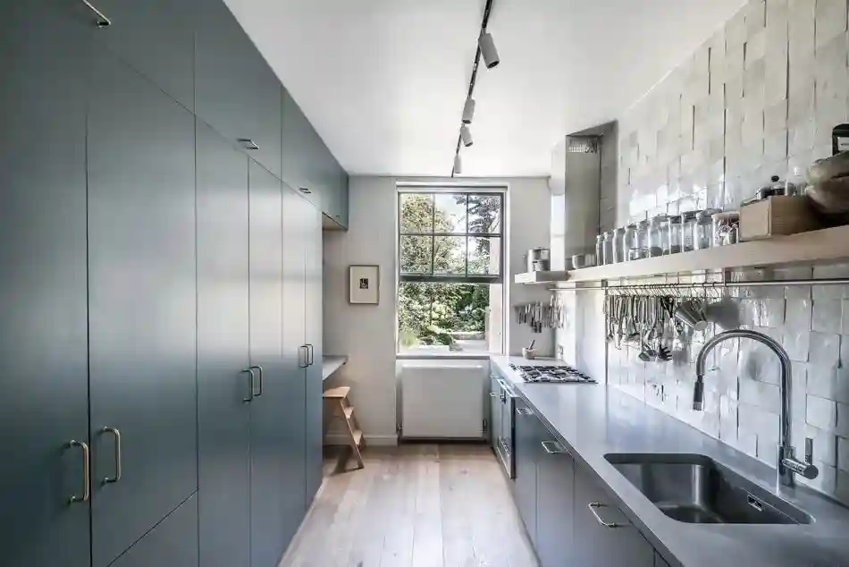 墨蓝色的橱柜和白色的墙面形成鲜明对比,分明的空间线条增添时尚感。