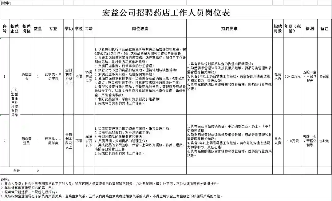 详见《宏益公司招聘药店工作人员岗位表》(附件1)。