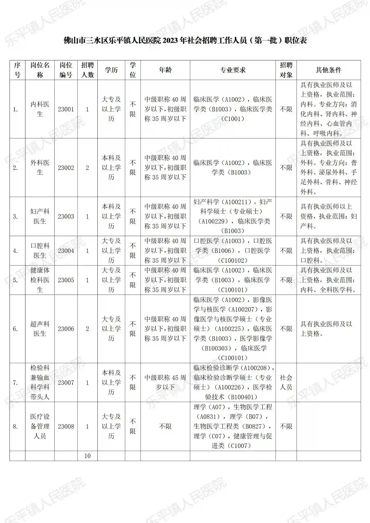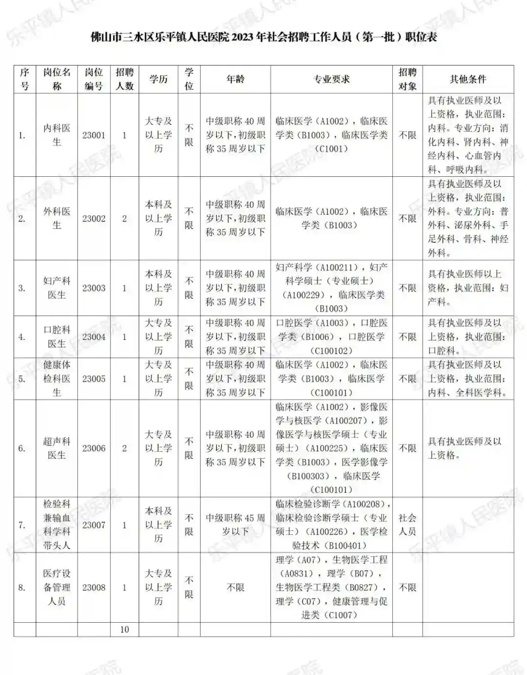 本次面向社会公开招聘佛山市三水区乐平镇人民医院编外工作人员10名。详见《佛山市三水区乐平镇人民医院2023年社会招聘工作人员(第一批)职位表》(附件1)。