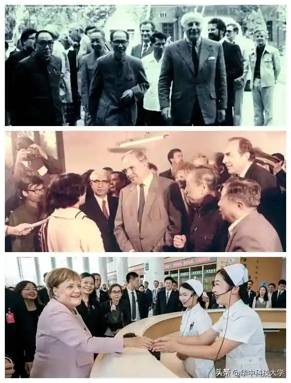 在这之后,我校与德方的交流从医学卫生领域扩展外交层面,到成为了中德交流的重要桥梁和窗口并一直延续至今。1981年和1984年,联邦德国前总统谢尔、联邦德国总理科尔分别访问同济医学院;2006年,德国总理默克尔接见武忠弼教授;2018年,德国总统施泰因迈尔接见王伟教授;2019年,德国总理默克尔一行到访我校,参观了附属同济医院光谷院区(中德友好医院)。