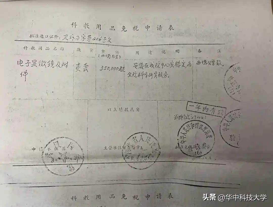 不久前,我校实设处工作人员在办理设备报废过程中,意外发现了一张1982年的进口科教用品免税申请单,上面写道:“卫外事字第206号文……价值35万马克的电子显微镜及附件一套。”据经济学院教授欧阳红兵介绍,当时的人民币与马克的汇率约为1:1.286,35万马克折合人民币约27.2万元。公开资料显示,1982年全国职工平均货币工资为798元。