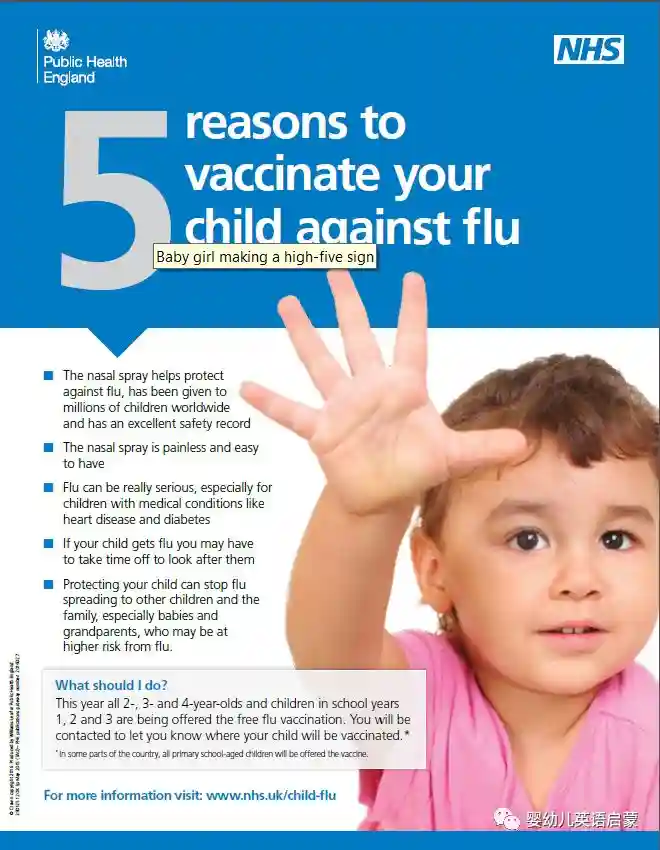 给孩子接种这种抗流感疫苗可以阻止流感传播,尤其能保护小宝宝和老人,因为他们最容易受到流感的攻击。所有2,3,4岁儿童、学校1-3年级学生,全部免费接种。(freefluvaccination)。