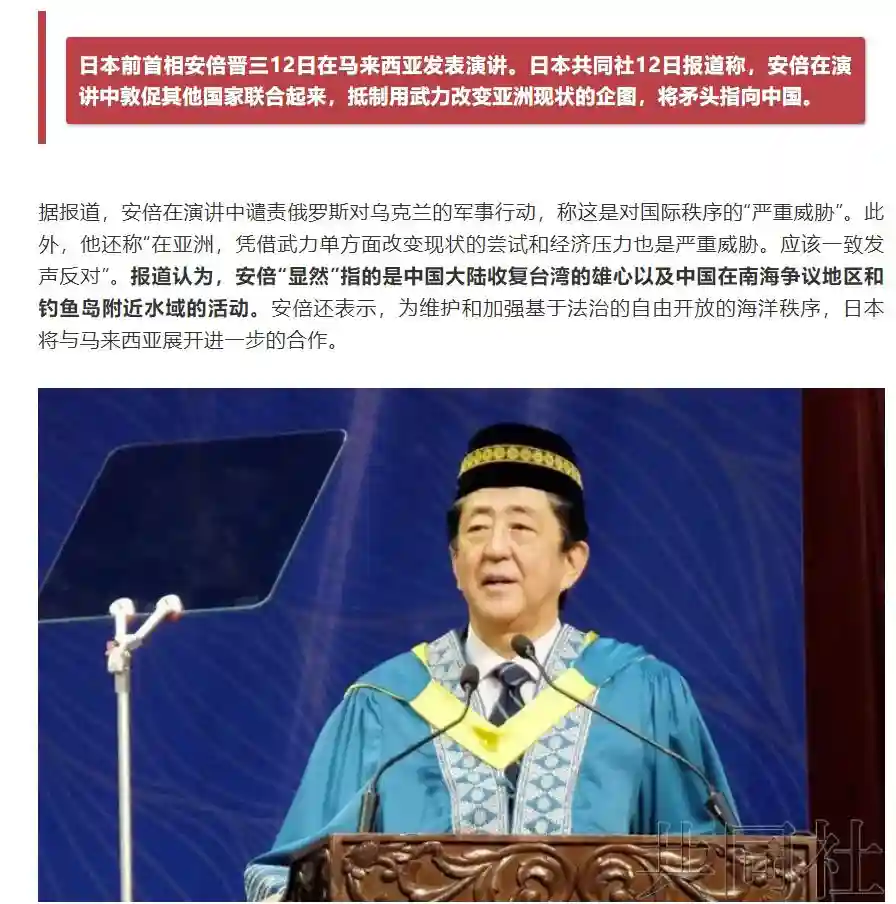 据环球网3月14道,今年是日本与马来西亚建交65周年,安倍晋三以日本首相岸田文雄特使的身份对马来西亚进行了为期4天的访问。在安倍晋三访问马来西亚期间,其发表了相当危险的言论。在演讲中,安倍晋三严厉谴责了俄罗斯针对乌克兰所发动的军事行动,同时呼吁亚洲各国应当联合抵制试图凭借武力单方面改变亚洲现状的行为。安倍还称,日本还将与马来西亚在维护现有的海洋秩序方面加强合作。考虑到最近一段时间以来安倍晋三所发表的诸如与美国进行“核共享”这样的危险言论,安倍此番言论所影射的正是中国。