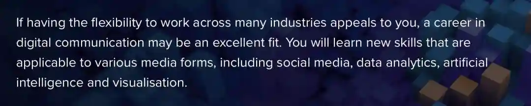 课程培养的是专注未来的专业技能和数字通信的专业知识,以及对数字创意经济和数字平台如何改变全球媒体环境的应用理解。
