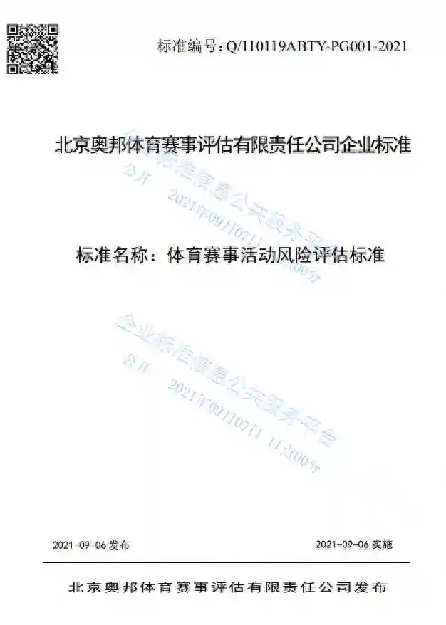 9月6日,北京奥邦体育赛事评估有限责任公司发布了《体育赛事活动风险评估标准》,这是在该领域国内的首个企业标准,对推动体育赛事活动风险评估行业具有重要意义。