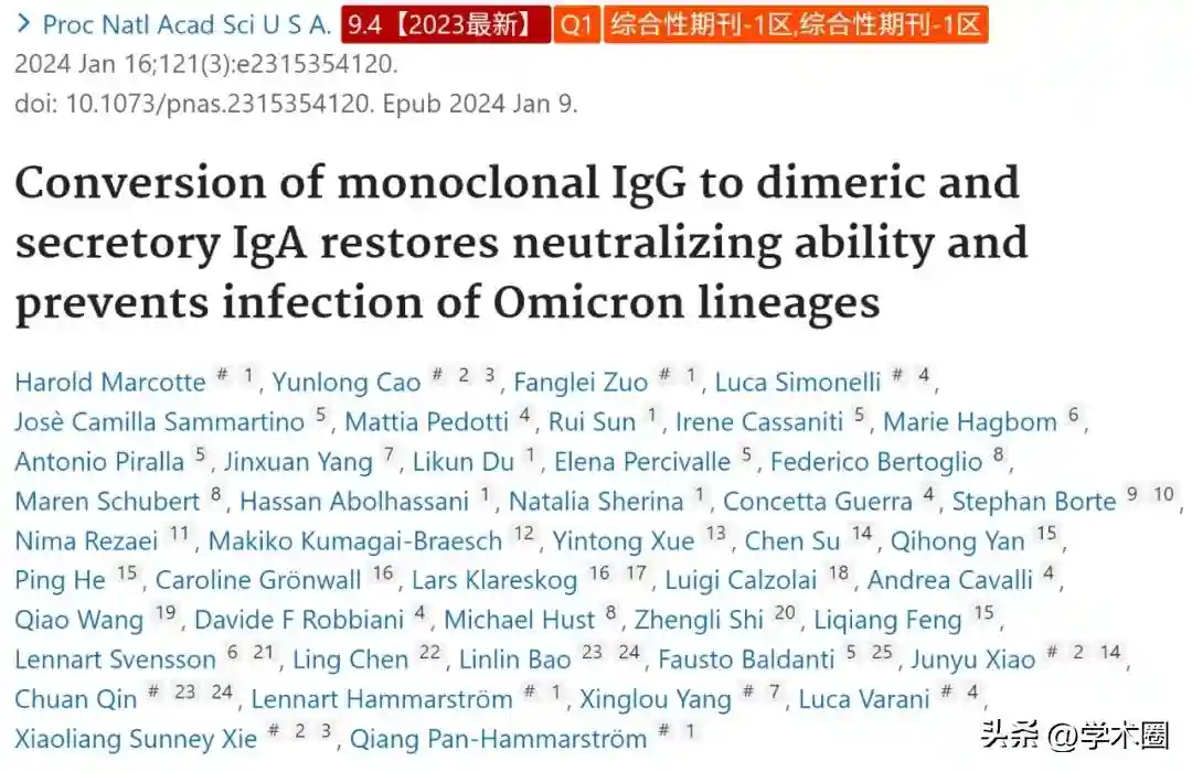 瑞典卡罗林斯卡医学院潘嫱院士北京大学谢晓亮院士北京大学曹云龙教授,发表研究论文:ConversionofmonoclonalIgGtodimericandsecretoryIgArestoresneutralizingabilityandpreventsinfectionofOmicronlineages