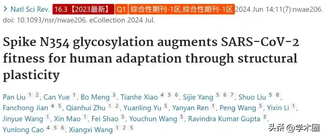 中科院感染与免疫重点实验室王祥喜教授北京大学曹云龙教授英国剑桥大学RavindraKumarGupta教授中国医学科学院王佑春教授,发表研究论文:SpikeN354glycosylationaugmentsSARS-CoV-2fitnessforhumanadaptationthroughstructuralplasticity