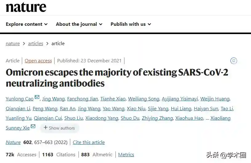 2021年12月23日,北京大学谢晓亮、曹云龙,中国食品药品检定研究院王佑春、北京大学生命科学学院肖俊宇、中科院生物物理研究所王祥喜为该文章的共同通讯作者在全球顶尖科研期刊《Nature》发表了题为“OmicronescapesthemajorityofexistingSARS-CoV-2neutralizingantibodies”的研究论文。北京大学曹云龙、王菁、简繁冲、肖天贺、宋玮良、阿依江、中国食品药品检定研究院黄维金为文章的共同第一作者。