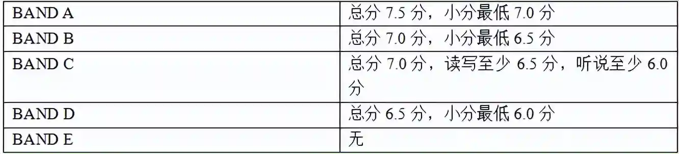 本科学位和硕士学位中不同专业对英语的要求不同。大部分专业要求雅思总分6.5分,单项不低于5.5分。医学类专业或者商科类可能会要求总分7.0,小分不低于6.5。