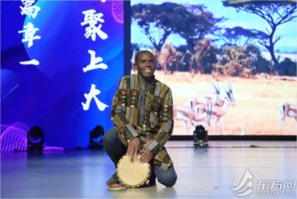 民族舞蹈节目《舞洲四海》中,一名来自喀麦隆的留学生正在击鼓伴奏。