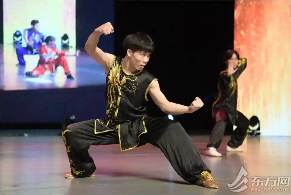 来自上海大学体育学院的中国学生正在表演节目《中国功夫》。