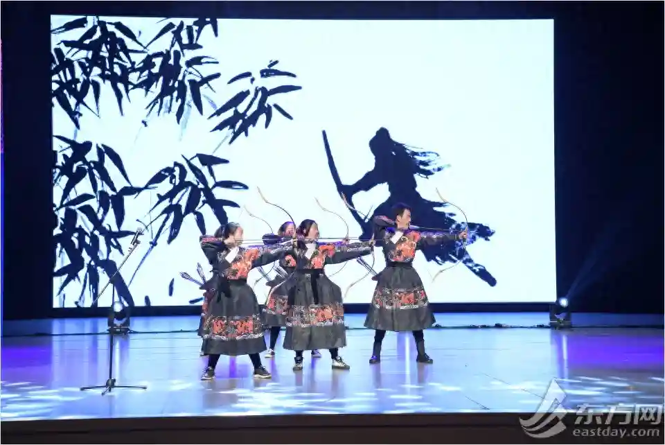 中国学生正在表演“射箭”。