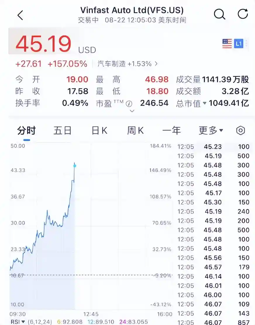 8月23日消息,越南电动汽车生产商VinFast持续飙升,现涨幅扩大至160%,市值站上1000亿美元,差不多7000多亿人民币了。超越保时捷,成为全球市值第三的上市汽车股。