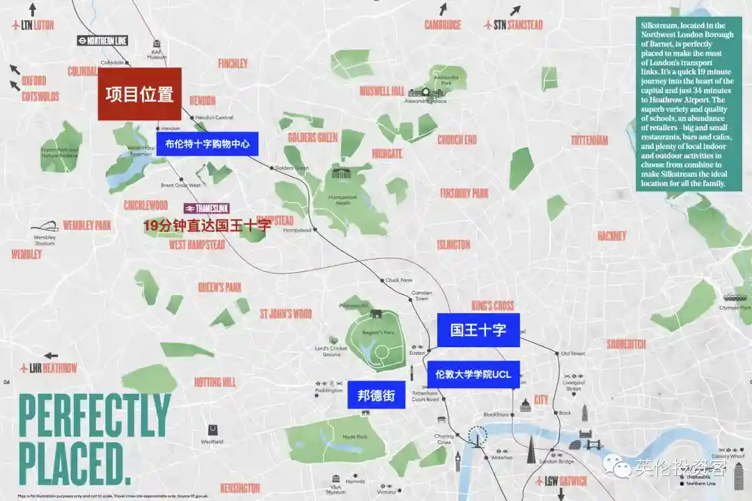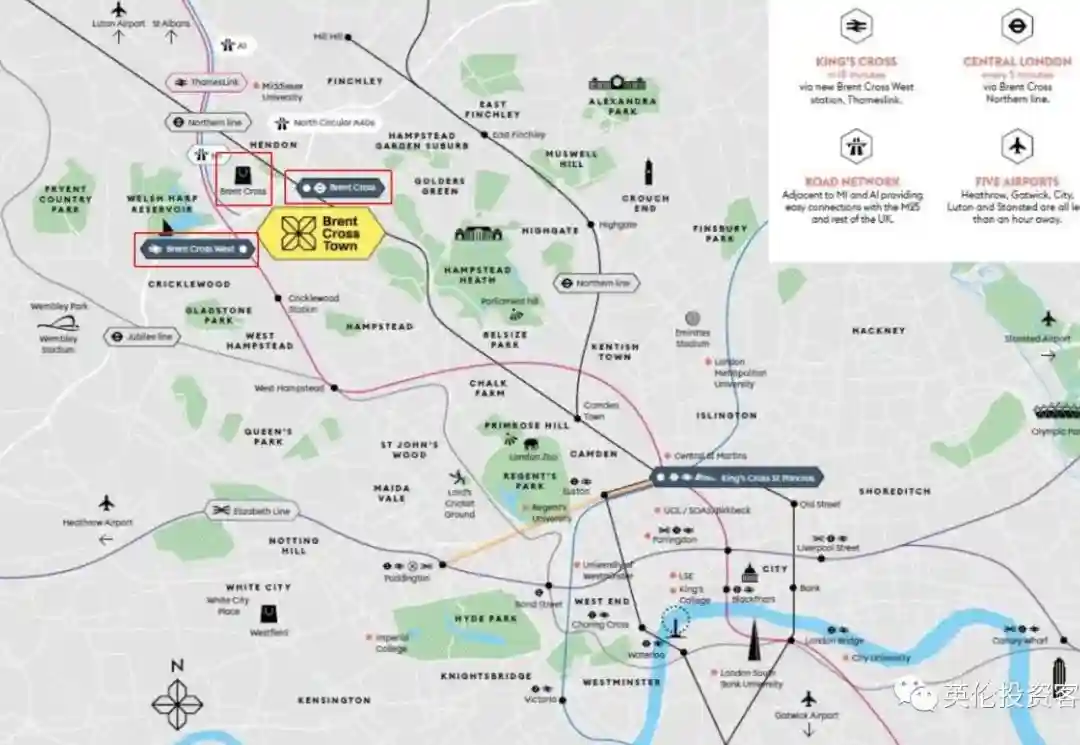 位置:落于伦敦市中心以北,紧邻大型购物中心BrentCrossShopping,临近著名富人区Hampstead和GoldersGreen。