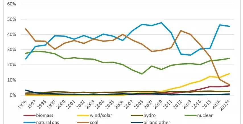 截至2016年底,英国电力系统的总装机容量为98GW,其中燃气发电占比最高,达到了46%。1996-2017年间,英国电网中各类电源装机比例变化见图1。近五年来,风力发电与太阳能发电在英国电力结构中的比例快速攀升,而燃煤发电比例逐年下降。