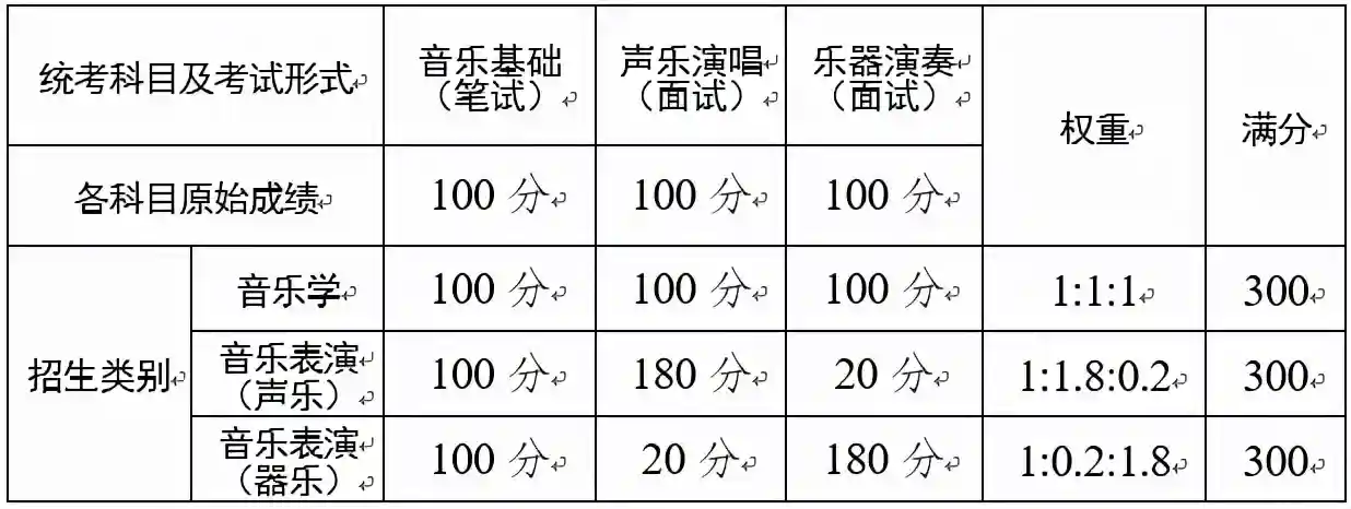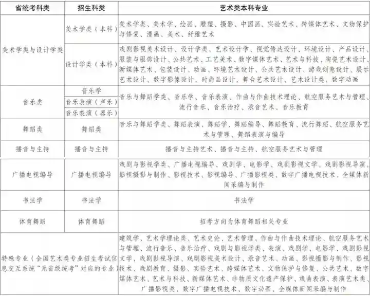 统考设音乐学、音乐表演(声乐)、音乐表演(器乐)、美术学类(本科)、设计学类(本科)、美术学类与设计学类(专科)、舞蹈类、播音与主持、体育舞蹈、广播电视编导、书法学11个招生类别。其中美术学类(本科)、设计学类(本科)、美术学类与设计学类(专科)均认可美术学类与设计学类统考成绩;音乐学、音乐表演(声乐)、音乐表演(器乐)分别认可参加音乐类统考后根据各招生类别所对应的考试科目权重折算的统考成绩;舞蹈类、播音与主持、体育舞蹈、广播电视编导、书法学分别认可相应的统考成绩。