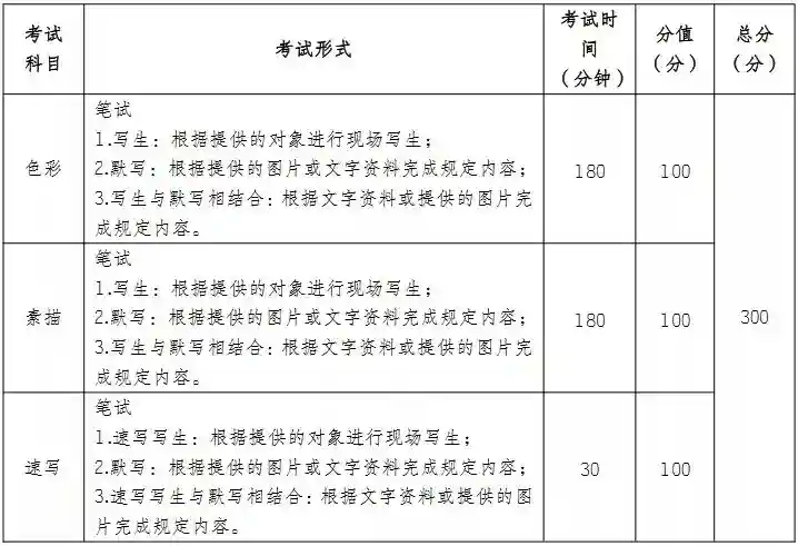 书法学专业考试包括作品临摹和书法创作两个科目,总分300分,作品临摹150分,书法创作150分。两个科目考试时间:180分钟。