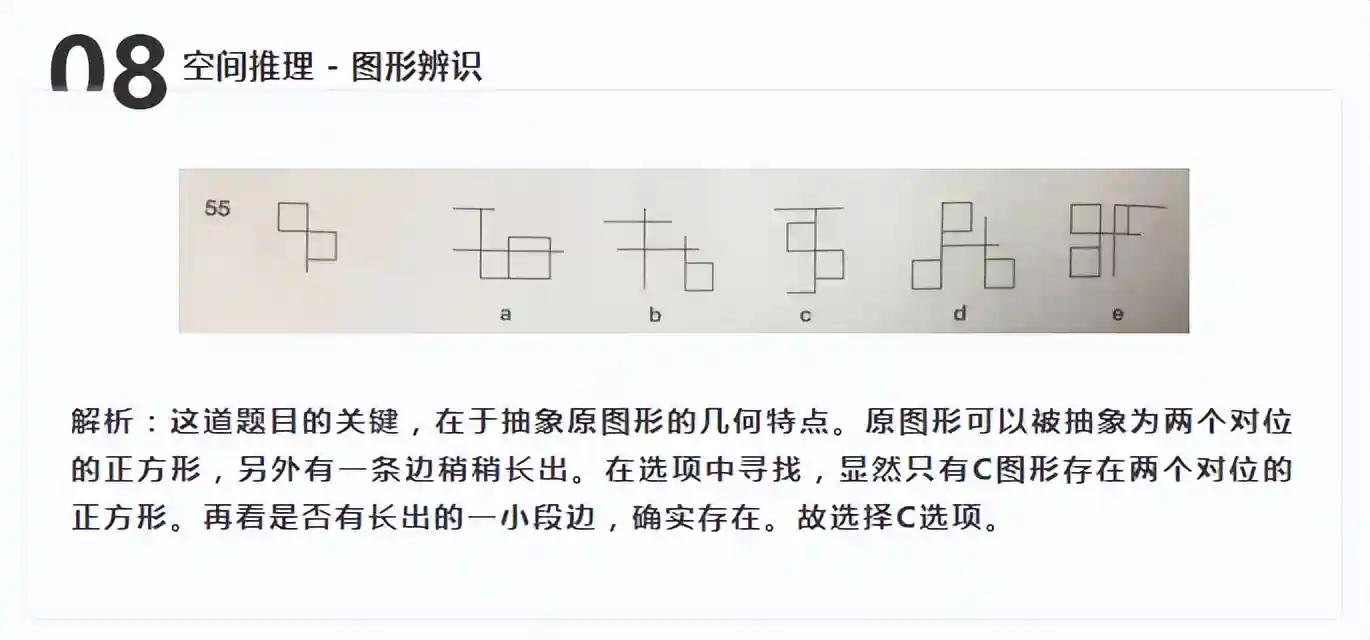 空间推理的第二种题型是图形辨识(figurerecognition)。这类题目会给出五个选择,学生要找出下方图形,究竟隐藏在哪个图形中。考察学生的空间想象能力。