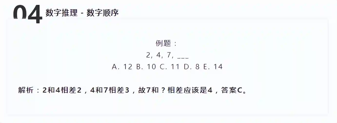 数字推理的第二种题型是数字顺序(numberseries)。这类题目会给出一组数字,通过发现数列的规律,找到下一个对应的数字。