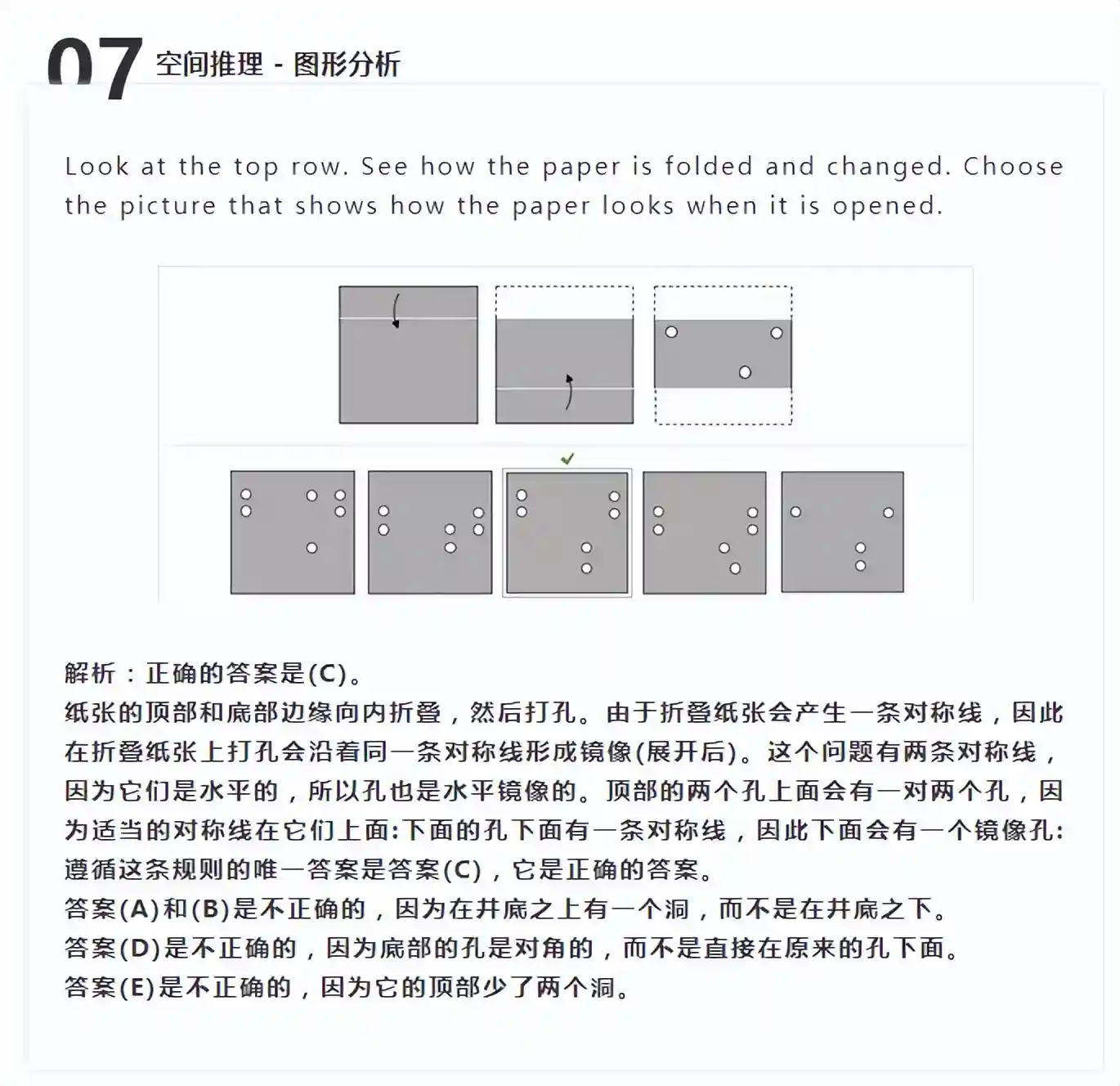 空间推理的第一种题型是图形分析(figureanalysis)。这类题目会给出三个图形,是通过连续折纸得到的。前两个图形,说明折纸的办法,第三个图是结果。