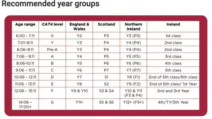 CAT4测试能帮助老师快速了解学生的长处与短板,挖掘孩子的潜力。适用于6-17岁的孩子,测试时长为2小时15分钟,测试形式为机考,包括9种不同等级: