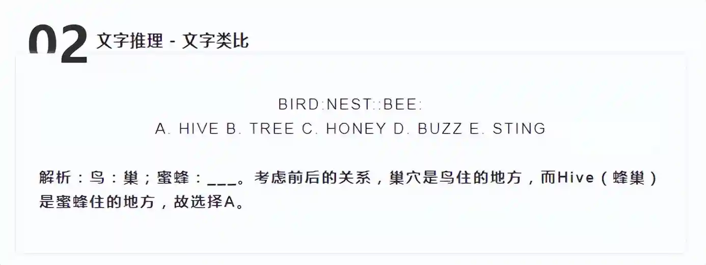 文字推理的第二种题型叫文字类比(verbalanalogies),需要一定的阅读和词汇能力,通过单词的逻辑顺序和认识来进行测试。