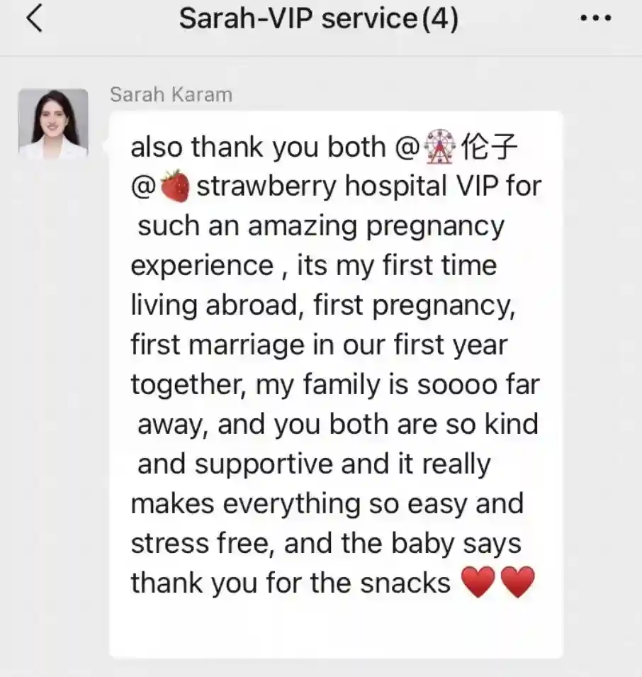”VIP健康服务中心的刘怡洋(Emma)具有中英双语沟通能力,在了解了Sarah的需求后,与Sarah的健康管家吕依伦一起陪同Sarah完成了首次产检。贴心细致的服务、专业顺畅的沟通令Sarah感到温暖和信任。